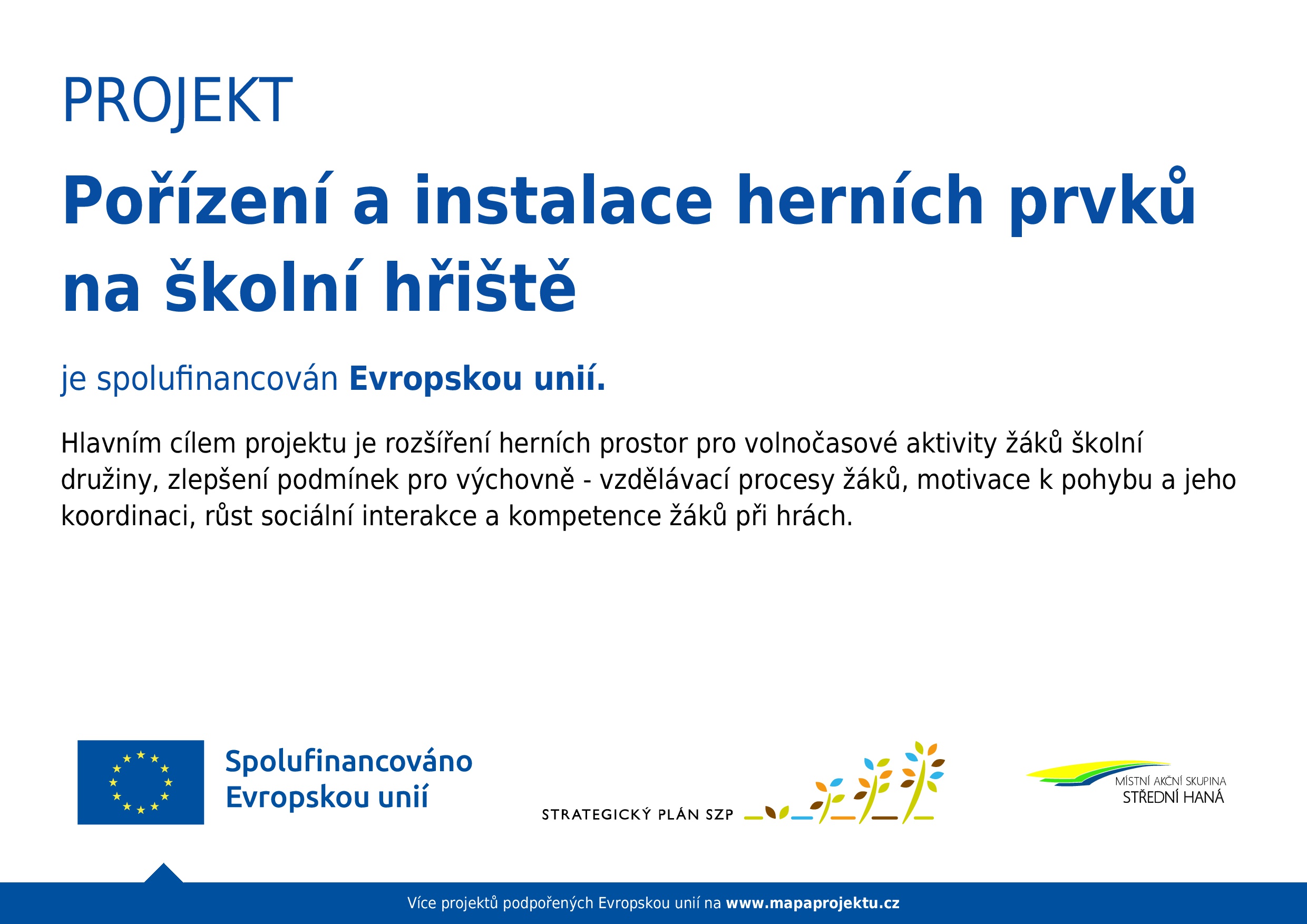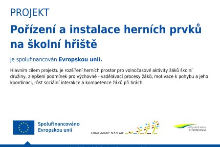 Projekt spočíval v pořízení a instalaci nových herních prvků na školním hřišti s cílem vytvořit bezpečné a atraktivní prostředí pro pohyb a hru žáků.